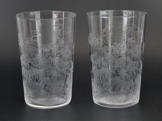Pair of Victorian wedding etched glass beakers with fern bush Birds monogram AR and IR 1894