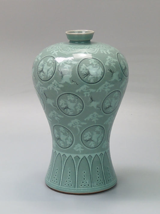 Large Korean Celadon Meiping Vase with Cranes 20th century