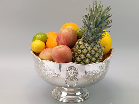 Large Punch Bowl, Silver-Plated, with Embossed Floral Scrolls and Lion Mask Handles by Pinder Bros