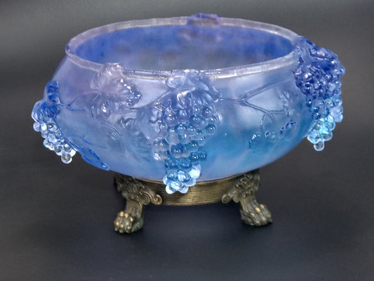 Pale Indigo Glass Bowl with Grapevine Motif on Brass Lion Feet, Pâte de Verre by I. Roubloff