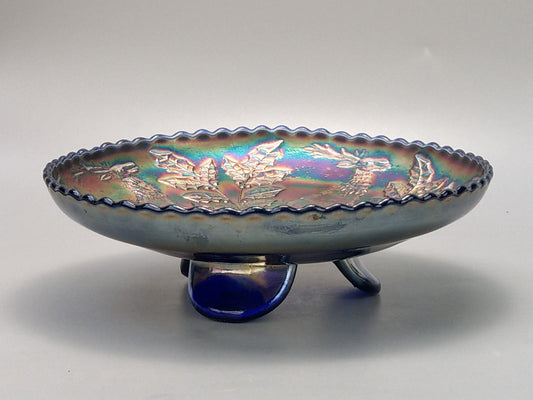 Fenton Carnival Blue Glass Footed Bowl Stag and Holly (Electric)