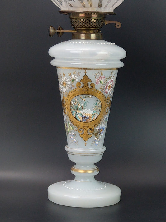 Large Opaque milk glass Oil Lamp enamel decorated with frosted glass lampshade