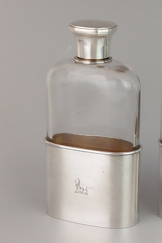 Large Silver mounted glass hip flask Lion crested by Gustave Keller Paris