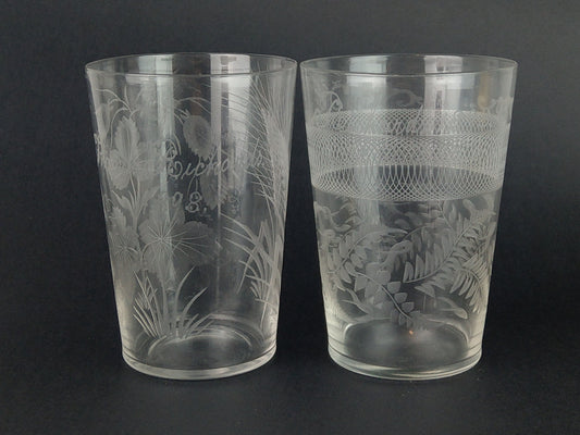 Victorian wedding etched glasses beakers Caroline & Thomas Richards dated 1898
