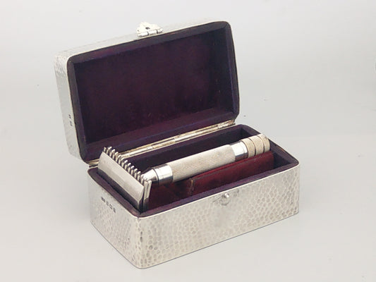 Sterling silver hammered box for razor by Levi and Salaman, 1910, with initials H.G.T.