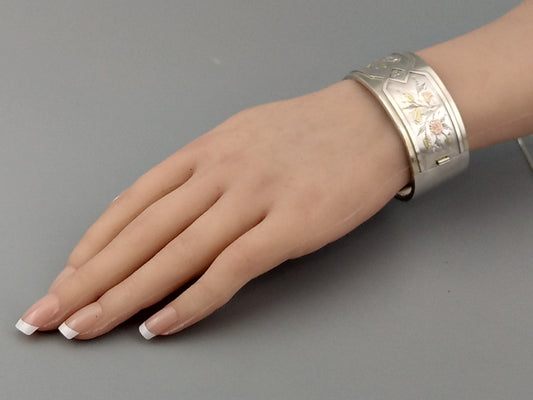 Antique sterling silver bangle with gold inlay flowers