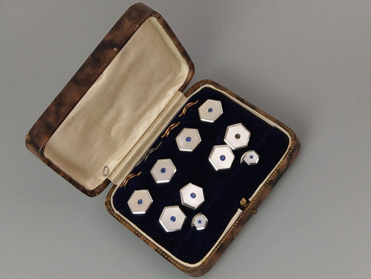 Art Deco Rectangle Silver mother of pearls with sapphires Cufflink and Buttons Dress Set