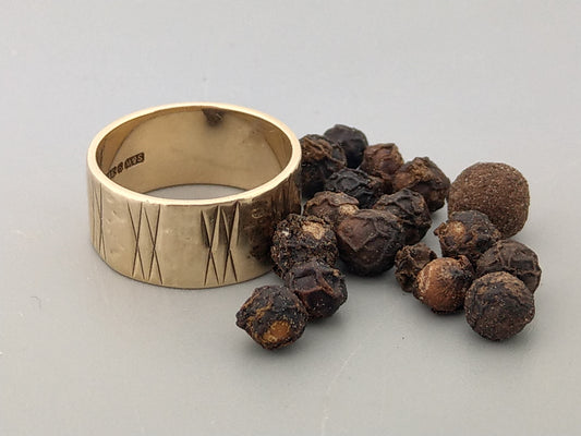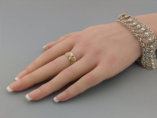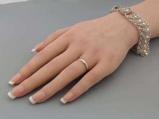 Ladies Patterned 9ct Gold Thick Cigar Band ring by Slade & Woolf c1969