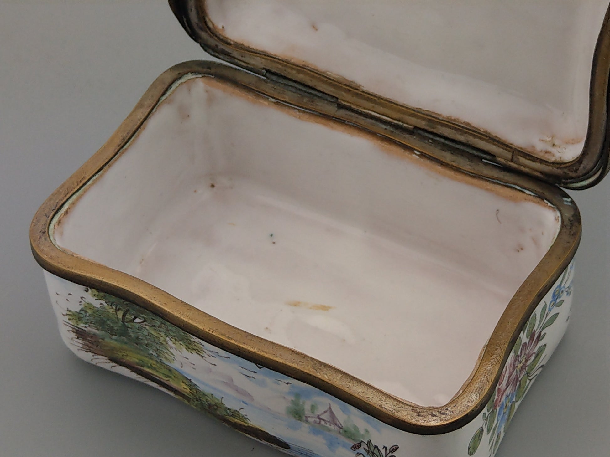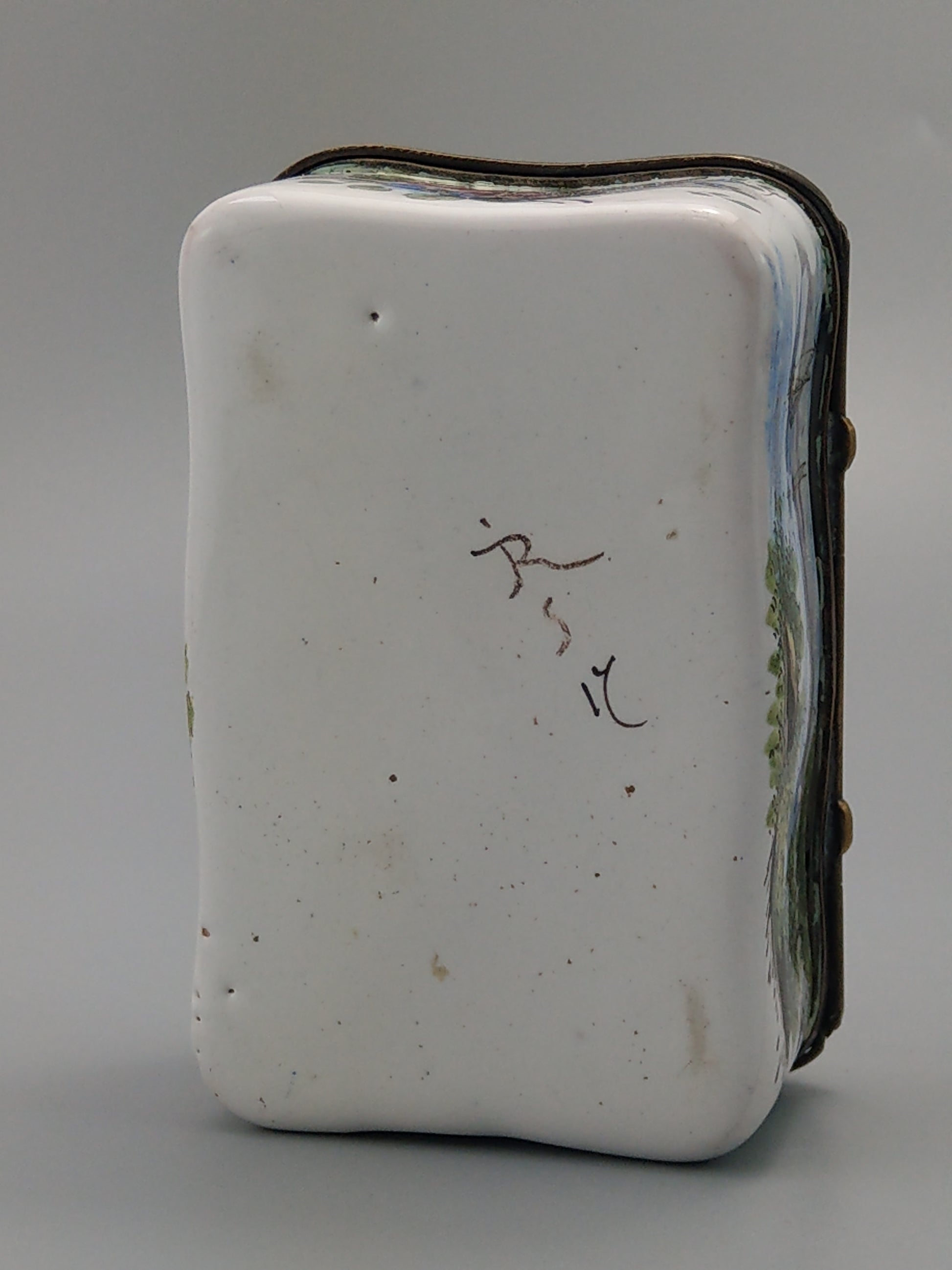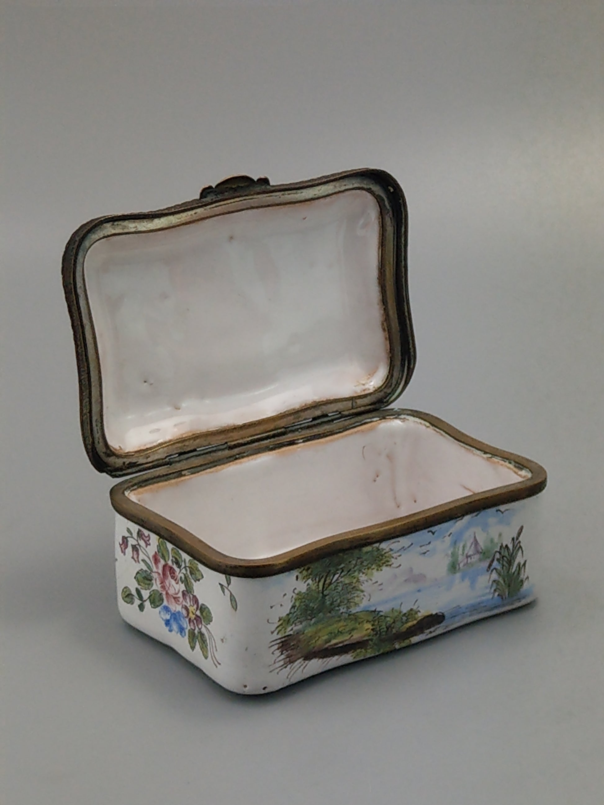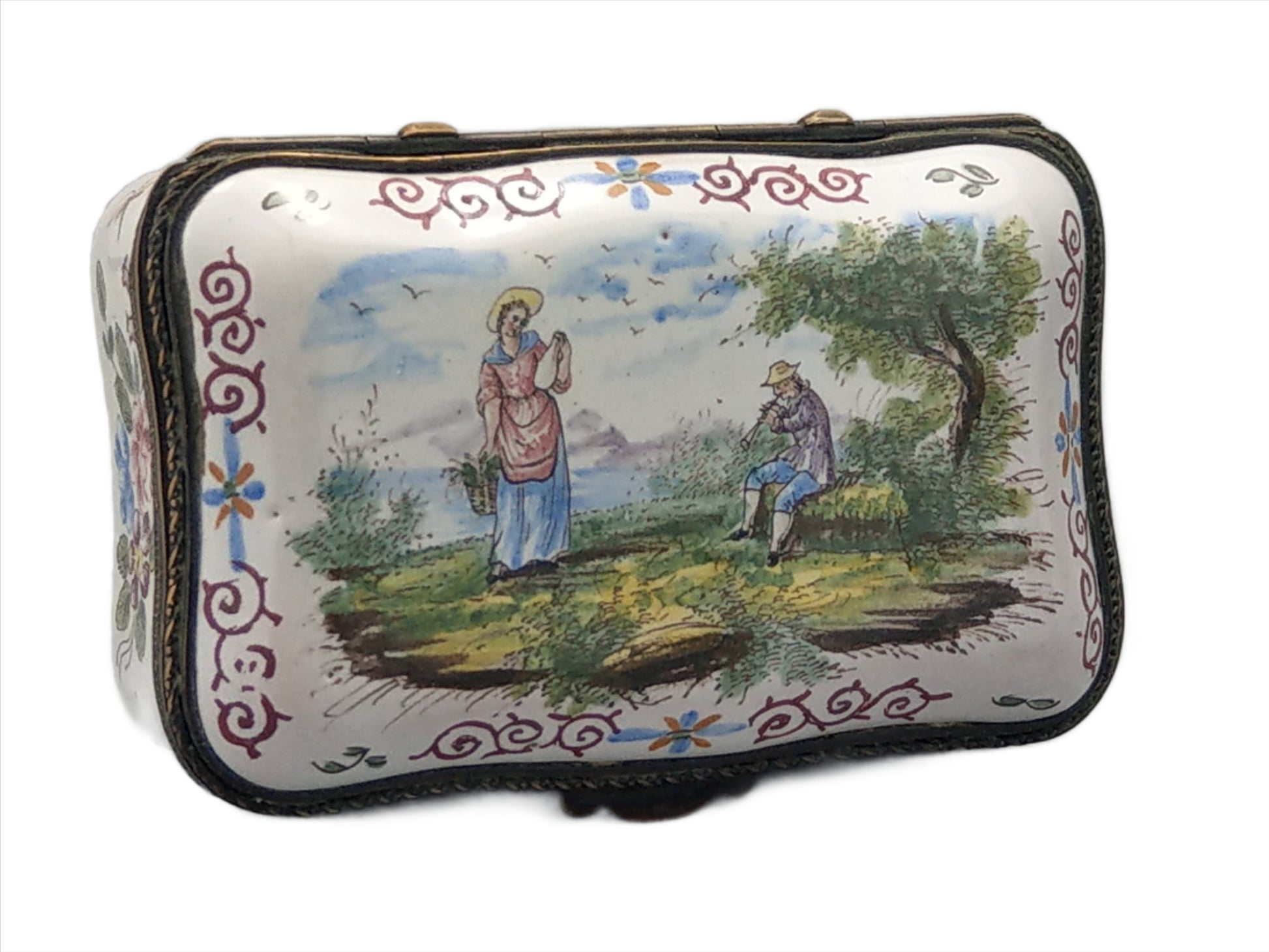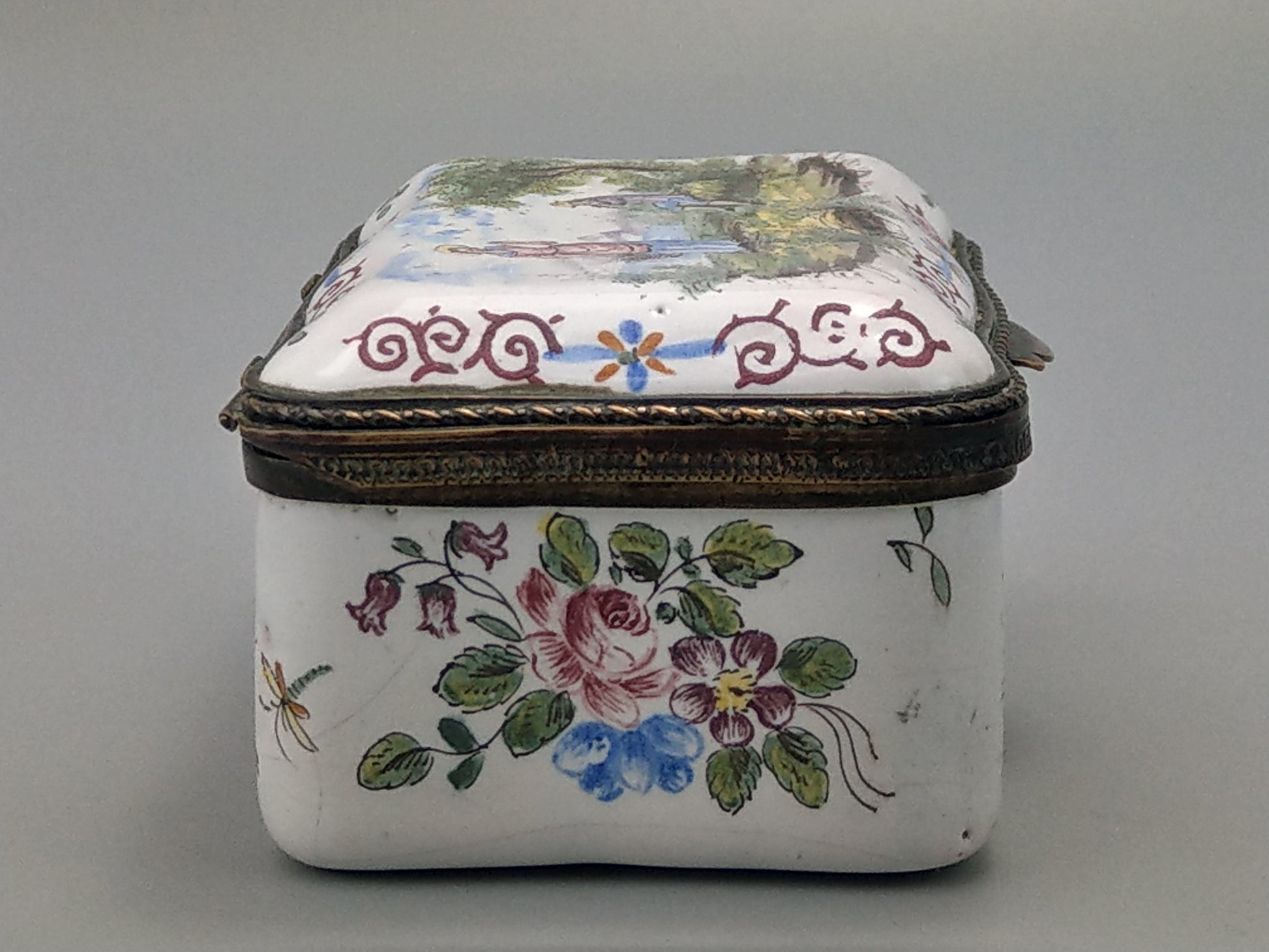 A late 18th-century French faience trinket box with an enamelled painted romantic scene